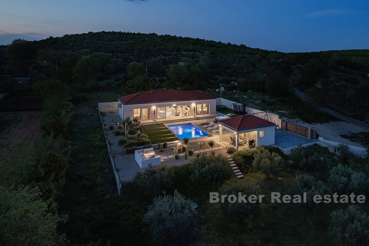 Tato luxusní přízemní vila se nachází v klidné a idylické lokalitě, obklopená středomořskou zelení a naprostým klidem – ideální útočiště od shonu každodenního života. Tato jedinečná nemovitost se nachází na prostorném pozemku o rozloze 1 034 m² a nabízí soukromí a klid s bazénem o rozloze 32 m² a terasou o rozloze 121 m² navrženou pro relaxaci a zábavu.