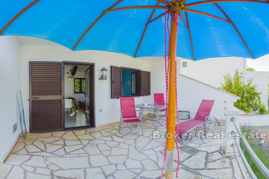 Den første leiligheten består av en åpen stue med kjøkken og spisestue, to soverom, ett bad og en overbygd terrasse. På den romslige terrassen er et sommerkjøkken med tilgang til en romslig dyrket hage som gir fred og privatliv.