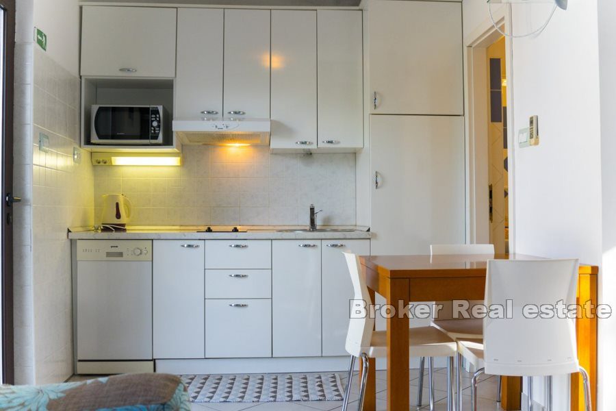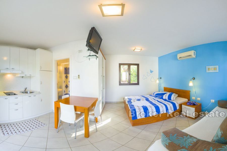 Den andre leiligheten består av stue, kjøkken, spisestue, ett soverom, bad og en overbygd terrasse med et sommerkjøkken med tilgang til Middelhavshagen.