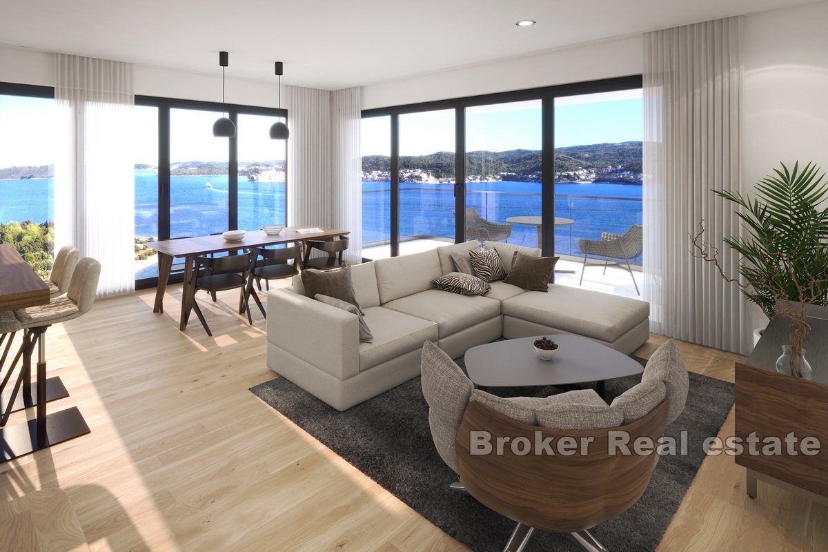 The interior includes a spacious living room with kitchen and dining area, filled with natural light and with access to a terrace with a beautiful sea view.
